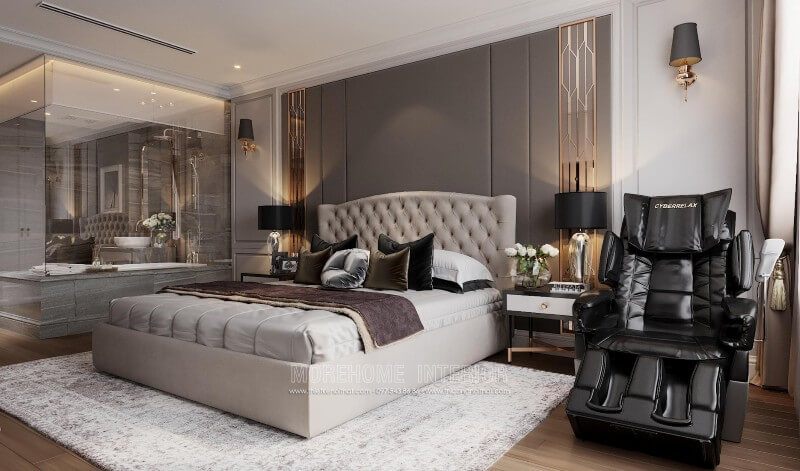Bố trí nội thất phòng ngủ Master sang trọng với chiếc giường ngủ bọc da phong cách tân cổ điển