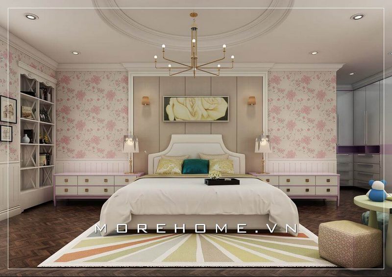 Giường ngủ biệt thự cao cấp được thiết kế theo phong cách tân cổ điển nhẹ nhàng mà đơn giản, phần đầu giường cách điệu lạ mắt được gia chủ lựa chọn trong mẫu thiết kế phòng ngủ này
