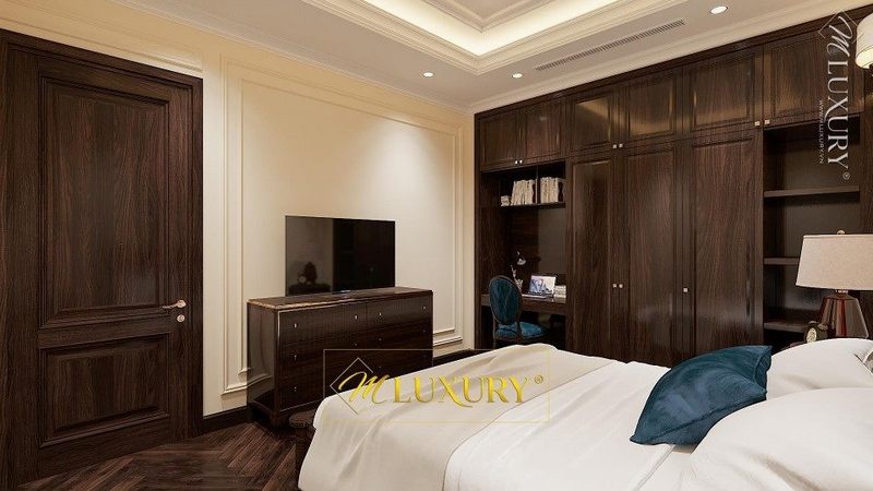 Phòng ngủ biệt thự được thiết kế theo kiểu dáng tân cổ điển vô cùng sang trọng và cuốn hút, góp phần mang đến cảm giác thoải mái, thân thiện và dễ chịu, cho người dùng có được giấc ngủ sâu hơn