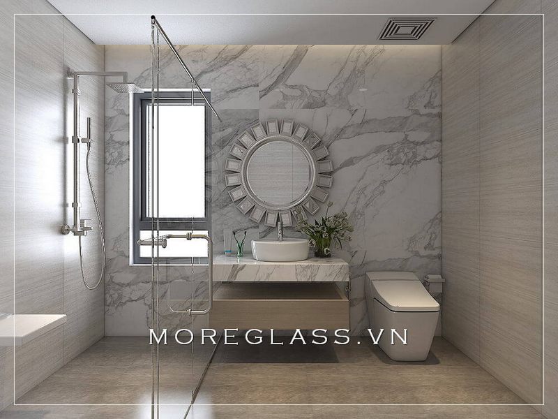 Phòng tắm chung cư được trang trí bằng các thiết bị vệ sinh hiện đại, được bổ sung thêm gương trang trí, đá ốp tường và vách tắm kính.