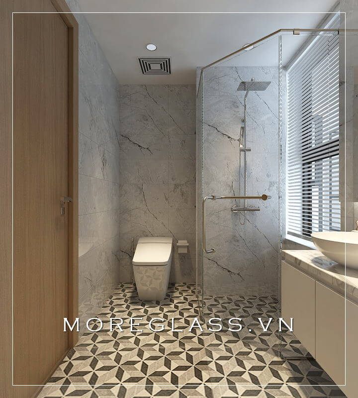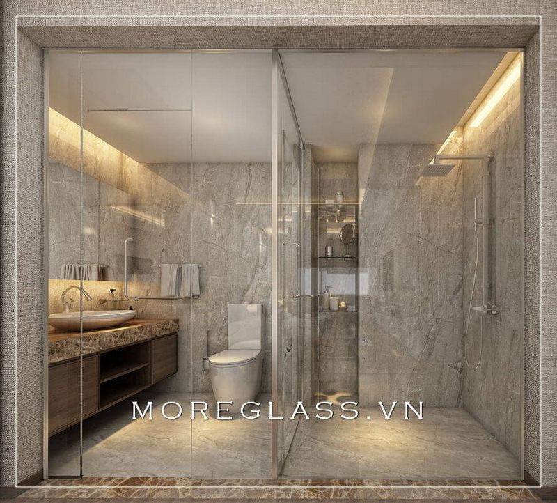 Sử dụng vách kính trong suốt trong phòng tắm để tách biệt các không gian ướt và khô, để tránh gây ra sự khó chịu do ánh nắng ướt ảnh hưởng đến các khu vực khác.