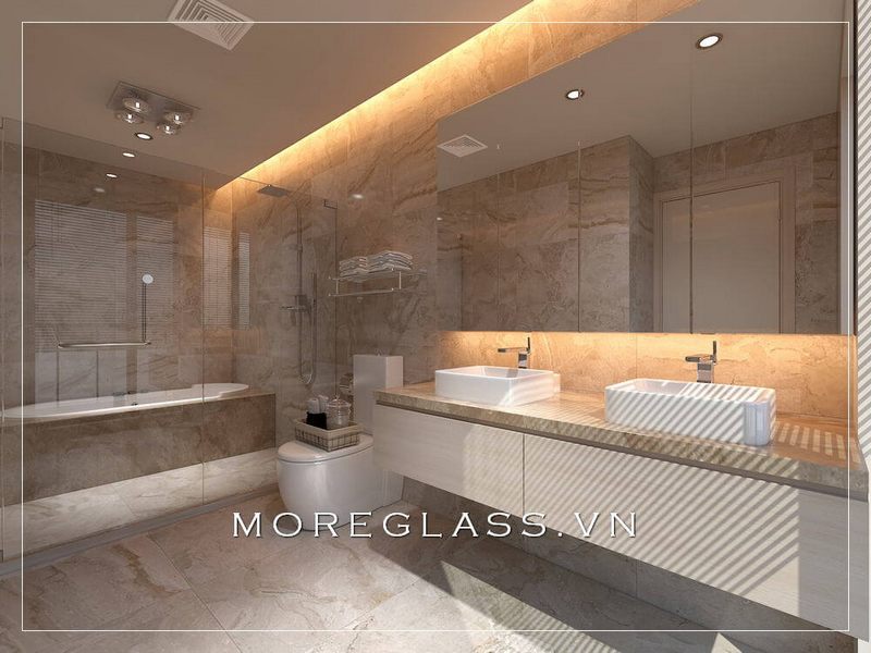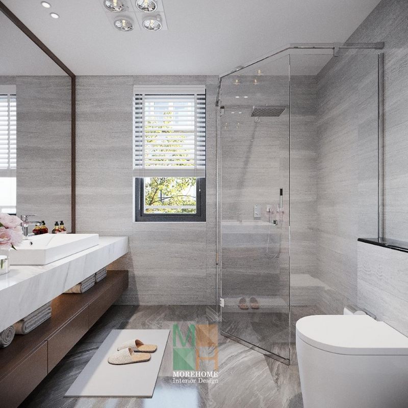 Mẫu thiết kế phòng tắm cao cấp mang lại vẻ đẹp sang trọng khi sử dụng đá ốp tường và lát sàn ấn tượng, phù hợp với không gian của biệt thự, nhà phố.