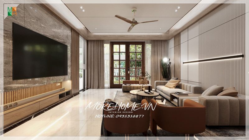 Nhà của bạn được thiết kế với những chi tiết tinh tế và đặc trưng của phong cách tân cổ điển, từ đường chỉ phào đến bộ bàn ghế sofa phòng khách. Chân ghế gỗ tự nhiên uốn lượn mềm mại, tạo nên một không gian sang trọng và tinh tế.