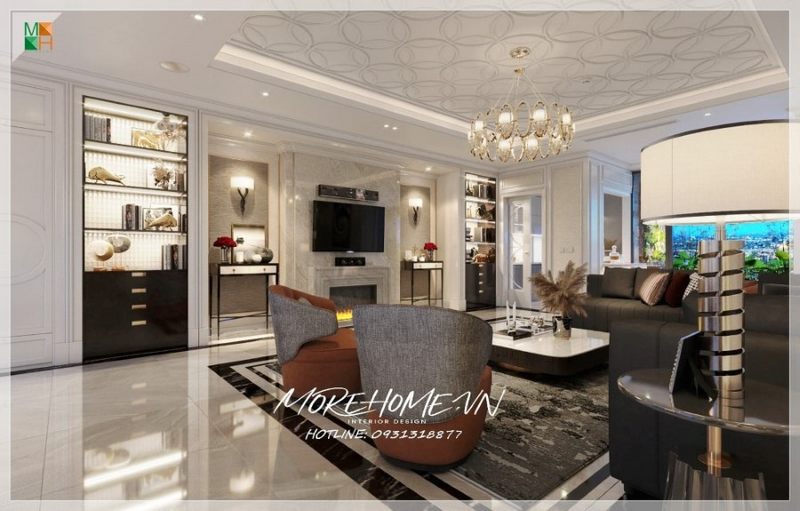 Sắp xếp nội thất phòng khách tân cổ điển đẹp, sang trọng tại Palm Garden.