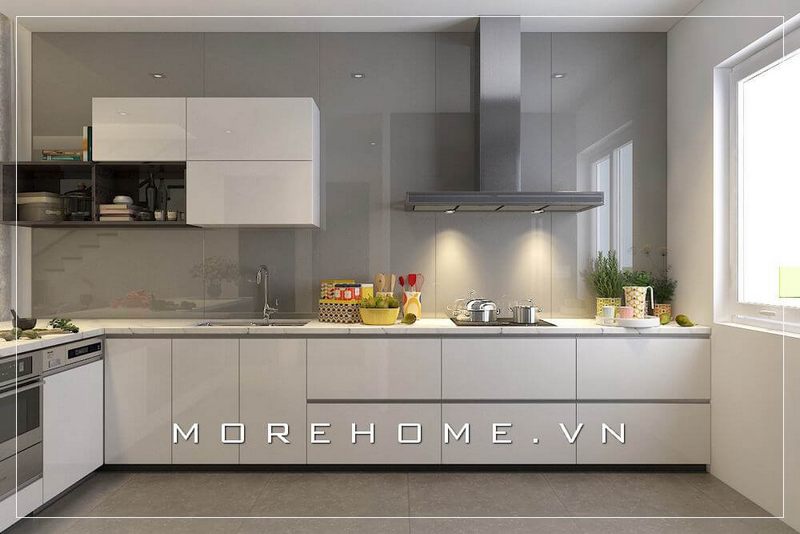 Kính ốp bếp màu ghi giúp không gian bếp trở nên thoải mái, tiện nghi và sạch sẽ hơn, dù nhỏ cũng đầy đủ độ thoáng đãng.